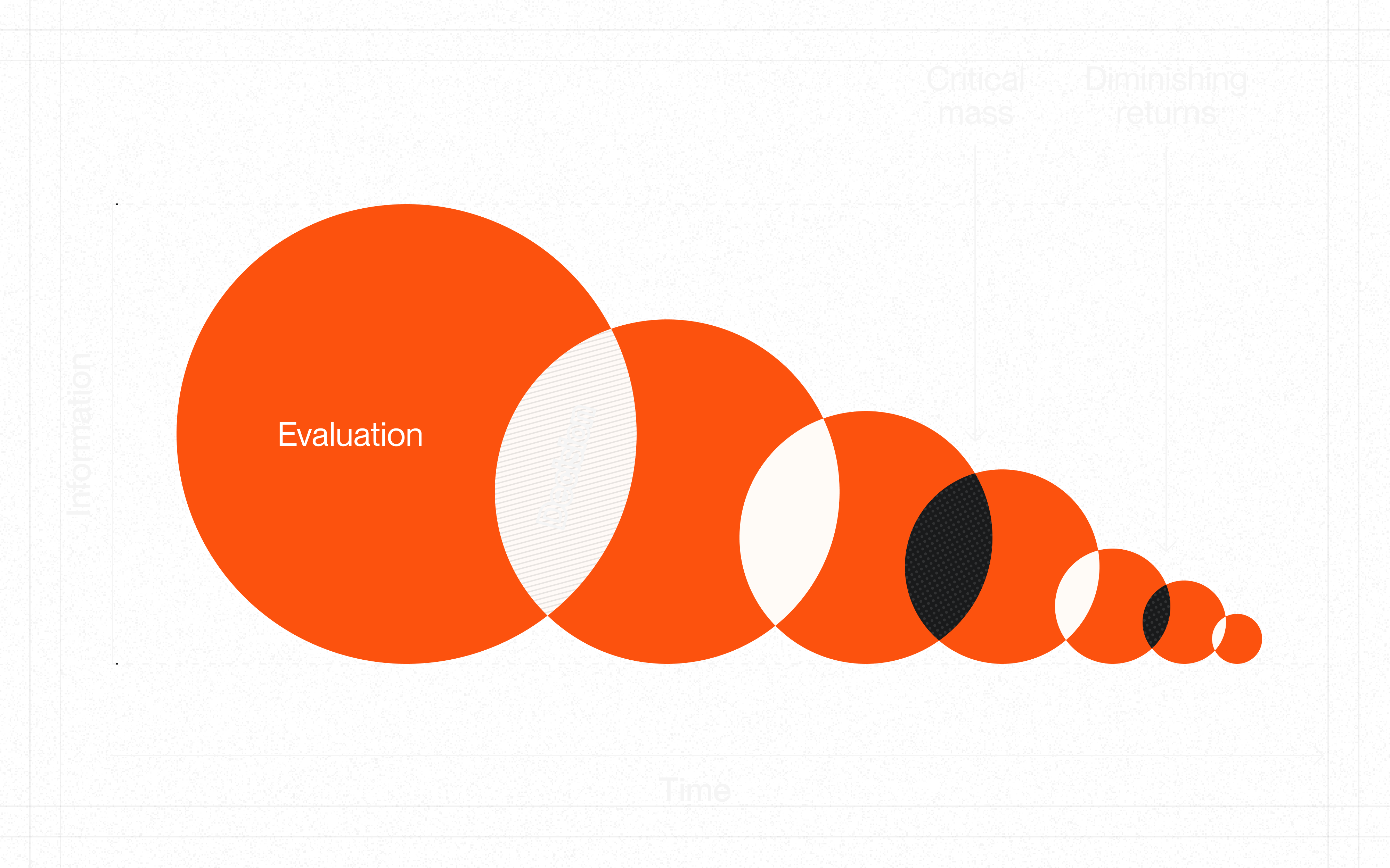 Evaluation. Early in any decision, new information has high marginal value. You're learning the constraints, stakeholders, and possibilities.